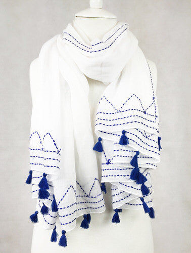 Soft as a summer cloud, this white cotton scarf is stitched with vibrant blue embroidery and finished with playful tassels for a carefree, bohemian vibe. Generously sized for versatility - drape it as a wrap, knot it as a scarf, or toss it over your shoulders as a beach cover -up. Lightweight, breathable, and effortlessly chic, its your go-everywhere accessory for sun drenched days and balmy nights.
