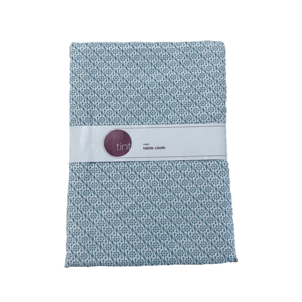 A classic white tablecloth covered with a delicate aqua flower design. It is 100% pre-washed cotton and made in Europe.