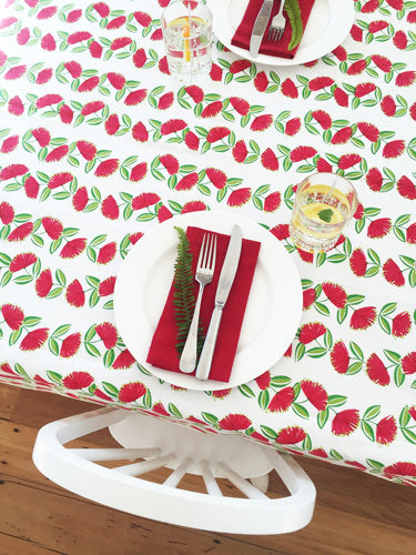 This vibrant red pohutukawa flower tablecloth will add a festive touch to your table. Made of 100% cotton and hand screen printed in India. The white background provides a strong contrast for the beautiful red pohutukawa flower, a symbol of summer in New Zealand. Matching table runner and placemats are also available.
